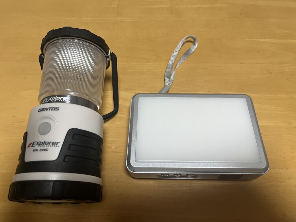 現在はこちらの「充電式LED照明」を使っています。(左はジェントスのランタン)